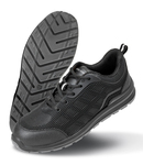 Thermoplastic PU. Water resistant leather trim. Moisture wicking lining. EN ISO 20345: 2011 SRA SB. Lightweight, unisex low cut sports trainer style. Breathable. Steel toe cap. Moulded PU scuff cap. Double density PU/PU sole. SRA slip and oil resistant outsole. Energy absorption heel. Padded tongue and collar. Heel loop. Spare insole set.