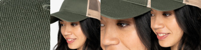 100% organic cotton twill. Recycled polyester mesh rear panels. 5 panel. Structured front panel. Pre-curved peak. Recycled plastic snapback size adjuster. Tag free.
