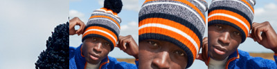100% recycled polyester. Micro fleece lining. Double layer knit. Multi stripe design. Engineered crown. Self colour pom pom. Oversized fold over cuff. Tear out label.