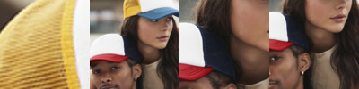 100% cotton twill. Flat top. Two embroidered characters, bear and bunny. Stitched brim. Elasticated back. Tag free.